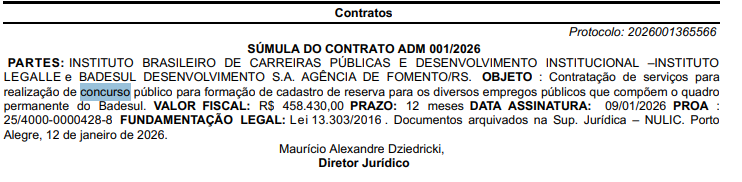 Nesta segunda-feira (12/1), foi publicada no Diário Oficial do estado a súmula do contrato entre a Badesul e o Instituto Legalle, confirmando oficialmente a banca organizadora do certame. O valor fiscal do contrato é de R$ 458.430,00 e o prazo previsto é de 12 meses, com data de assinatura em 9/1/2026.