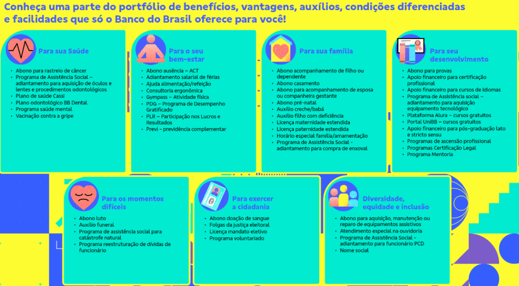 Veja os principais benefícios oferecidos aos funcionários do Banco do Brasil, em divulgação feita pelo próprio BB: