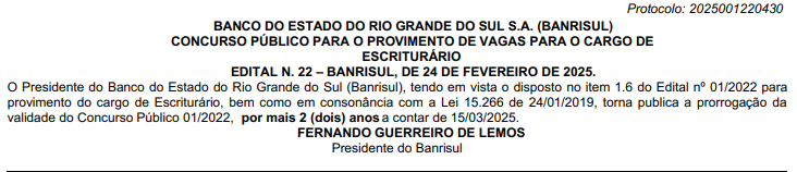O último concurso Banrisul (Banco do Estado do Rio Grande do Sul S.A) para escriturário foi prorrogado até 15 de março de 2027! O certame foi lançado em 2022 e ofertou 1.335 vagas imediatas de nível médio com salários iniciais de até R$ 2.963,01.A decisão, assinada pelo presidente do banco, Fernando Guerreiro de Lemos, oficializa a prorrogação da validade do certame que encerraria no mês de março de 2025. Com isso, o banco terá mais 24 meses para convocar todos os seus aprovados, caso a lista seja zerada antes da data limite, o Banrisul poderá ter um novo concurso público antes de 2027!O Banrisul tem um novo concurso previsto para 2025, serão ofertadas 100 vagas para o cargo de Técnico em Tecnologia da Informação. O cargo exigirá graduação na área de TI ou em qualquer curso superior com pós-graduação na área de TI (mínimo de 360 horas).Contudo, ainda não existem mais informações sobre os prazos das etapas do certame. De acordo com o último edital, o salário inicial para o cargo é de R$ 4.240,94!Sem tempo para estudar? Veja esse Material Gratuito!Se você sempre diz que não tem tempo para estudar ou para resolver seus problemas, este e-book vai te ajudar! Já te adianto: você TEM tempo para estudar. Confira as dicas do Prof. Ronaldo e começa agora sua preparação!Clique no botão abaixo, e garanta seu e-book gratuito:QUERO O MEU MATERIAL GRATUITO!Último concurso BanrisulO último edital do concurso Banrisul para o cargo de Técnico em Tecnologia da Informação foi publicado em junho de 2022. Organizado pelo Cebraspe, o certame ofertou 274 vagas com inicial de R$ 4.240,94.Confira, abaixo, a distribuição das vagas:Os candidatos foram avaliados por meio de provas objetivas, de caráter eliminatório e classificatório. As avaliações foram compostas por 120 itens para julgamento em CERTO ou ERRADO, conforme distribuição a seguir:Foi reprovado nas provas objetivas e eliminado do concurso público o candidato que se enquadrou em pelo menos um dos itens a seguir:a) obteve nota inferior a 10,00 pontos na prova objetiva de conhecimentos básicos P1;b) obteve nota inferior a 21,00 pontos na prova objetiva de conhecimentos específicos P2;c) obteve nota inferior a 36,00 pontos no conjunto das provas objetivas.As disciplinas cobradas em conhecimentos básicos foram as seguintes:Língua Portuguesa;Língua Inglesa;Raciocínio Lógico;Legislação referente à temática de gênero, raça e etnia.Canal de notícias do Direção Concursos no WhatsApp! O Direção possui um canal exclusivo para envio de notícias no WhatsApp! Além de todas as novidades do mundo dos concursos, lá você encontra e-books e outros materiais gratuitos, cupons EXCLUSIVOS de desconto, aulas GRATUITAS e muito mais.Não perca tempo e entre agora!ENTRE AGORA NO CANAL DE NOTÍCIAS!Resumo do concurso BanrisulSituação: previstoVagas: 100Cargo: Técnico em Tecnologia da InformaçãoEscolaridade: nível superiorSalário: R$ 4.240,94 (último edital)Último edital para a áreaA MELHOR SEMANA DO CONSUMIDOR DO DIREÇÃO ESTÁ CHEGANDO!Atenção, concurseiros!De 10 a 15 de Março, acontecerá a Semana do Consumidor do Direção Concursos! Com preços incríveis e descontos imperdíveis, você não pode perder essa oportunidade!Aproveite e garanta acesso vitalício a mais de 4.000 cursos, materiais em PDF, sistema de questões e muito mais! Tudo o que você precisa para conquistar a sua sonhada aprovação.A Semana do Consumidor do Direção já está na porta, inscreva-se agora e participe ao vivo para aproveitar todos os benefícios! Não perca essa chance, se inscreva abaixo e aproveite!