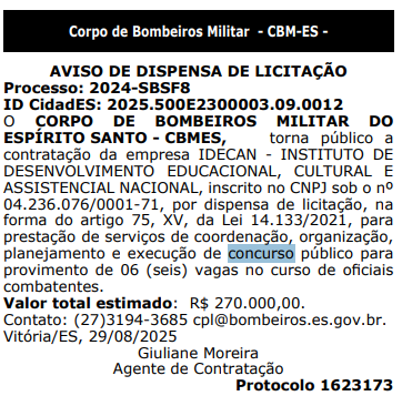 O aviso de dispensa de licitação que confirma o Idecan como empresa responsável pela seleção foi publicado em Diário Oficial do estado nesta segunda-feira (1/9).