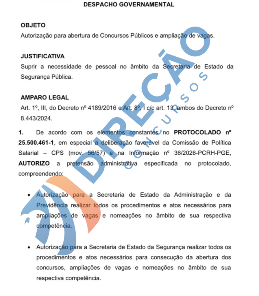 O documento tem como objeto a autorização para abertura de concursos públicos e ampliação de vagas no âmbito da Secretaria de Estado da Segurança Pública. A justificativa apresentada é suprir a necessidade de pessoal nas corporações.