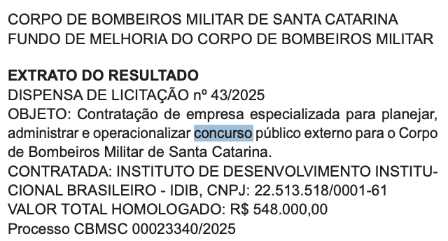 O novo concurso Bombeiros SC (Bombeiros Militar de Santa Catarina) acaba de avançar mais uma etapa importante rumo à publicação do edital. O Instituto de Desenvolvimento Institucional Brasileiro (IDIB) foi oficialmente contratado para planejar, administrar e operacionalizar o certame.