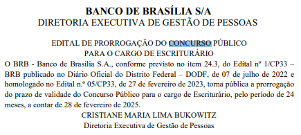O último edital do concurso BRB (Banco de Brasília) para o cargo de Escriturário teve a validade prorrogada por mais 2 anos!