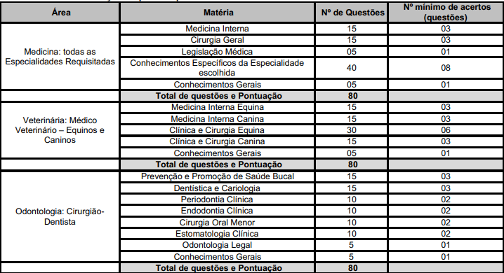 A Prova Objetiva será valorada em uma escala de 0 (zero) a 100 (cem) pontos, sendo 1,25 por questão. Serão considerados aprovados nesta etapa os candidatos que obtiverem pontuação igual ou superior a 60 (sessenta) pontos e, simultaneamente, atingirem o número mínimo de acertos por matéria como mostrado na tabela anterior.