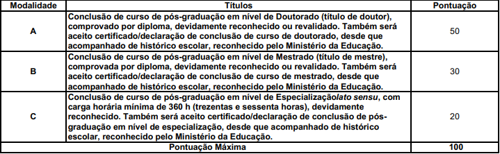 A Prova de Títulos terá caráter exclusivamente classificatório e a nota mínima partirá de 0 (zero) até o máximo de 100 (cem) pontos. Para efeitos de pontuação, somente será aceito 1 (um) título por modalidade.