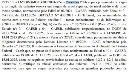 Isso porque foi publicada em Diário Oficial do Distrito Federal nesta quinta-feira (6/3), decisão do TCDF que informa a determinação que o edital do certame seja retificado até o dia 12 de março.