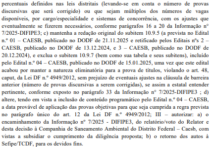 - c) mantenha a redação original do subitem 10.9.5 (a prevista no Edital n.º 01 – CAESB, publicado no DODF de 21.11.2025 e retificado pelos Editais nºs 2 – CAESB, publicado no DODF de 13.12.2024, e 3 – CAESB, publicado no DODF de 20.12.2024), e exclua o subitem 10.9.7 (bem como sua tabela e seus subitens), incluído pelo Edital n.º 04 – CAESB, publicado no DODF de 15.01.2025, uma vez que este edital acabou por manter a natureza eliminatória para a prova de títulos, violando o art. 48, caput, da Lei DF n.º 4949/2012, sem prejuízo de eventuais ajustes na cláusula de barreira anterior (número de provas discursivas a serem corrigidas), se assim a estatal entender pertinente;