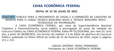 A informação foi publicada em Diário Oficial da União nesta quarta-feira (23/7). Segundo o documento, a validade do certame será prorrogada por mais um ano, a contar de 6 de agosto de 2025. Ou seja, seguirá vigente até agosto de 2026.