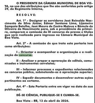 A Câmara Municipal de Boa Vista (RR) avança na organização do seu concurso público. Nesta quarta-feira (15/4), foi publicada no Diário Oficial a portaria que designa os membros da comissão responsável pela condução do certame.