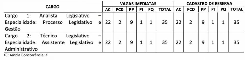 - Cargos: Analista e Técnico Legislativo (especialidades)