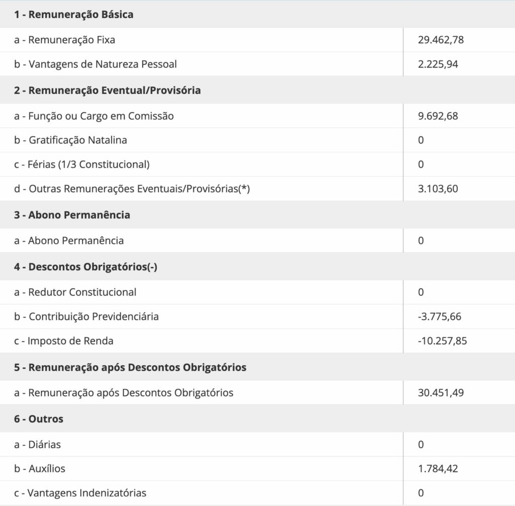 Os valores incluem remuneração fixa, vantagens pessoais, eventuais (como férias e outras gratificações) e auxílios.