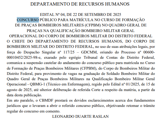 De acordo com a publicação, a suspensão foi determinada pelo Tribunal de Contas do Distrito Federal (TCDF) e vale até que haja uma deliberação final sobre o caso. O CBMDF informou que prestará os esclarecimentos necessários à Corte com o objetivo de retomar o andamento regular do certame.