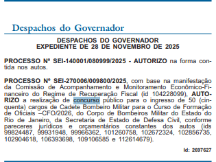 O governador Cláudio Castro autorizou, nesta segunda-feira (1/12), a realização de um novo concurso público para o ingresso de 50 candidatos no Curso de Formação de Oficiais (CFO) 2026 do Corpo de Bombeiros Militar do estado do Rio de Janeiro (CBMERJ).