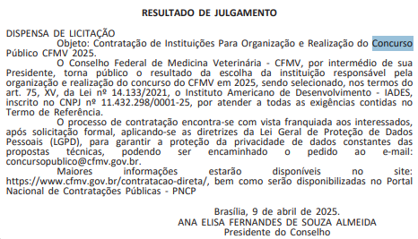 Isso porque foi publicado em Diário Oficial da União nesta quinta-feira (10/4), o resultado da escolha da banca, sendo o Iades o selecionado para organizar o certame.