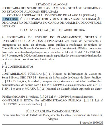A Controladoria-Geral do Estado de Alagoas (CGE AL) publicou o Edital nº 2, em 13 de abril de 2026, com uma retificação ao edital de abertura do concurso público para o cargo de Analista de Controle Interno. A alteração foi motivada por impugnação ao edital original e modifica tópicos do subitem 14.2 (Conhecimentos).