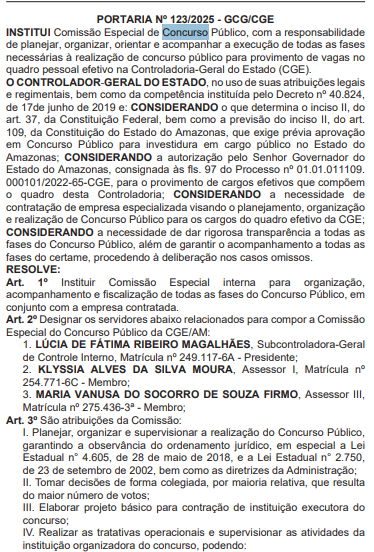 A Controladoria-Geral do Estado do Amazonas (CGE AM) deu um passo decisivo para a realização do seu aguardado concurso público. Foi publicada na última sexta-feira (28/11), em Diário Oficial do estado, a Portaria nº 123/2025, que institui a Comissão Especial responsável por todo o planejamento, organização e fiscalização do certame.