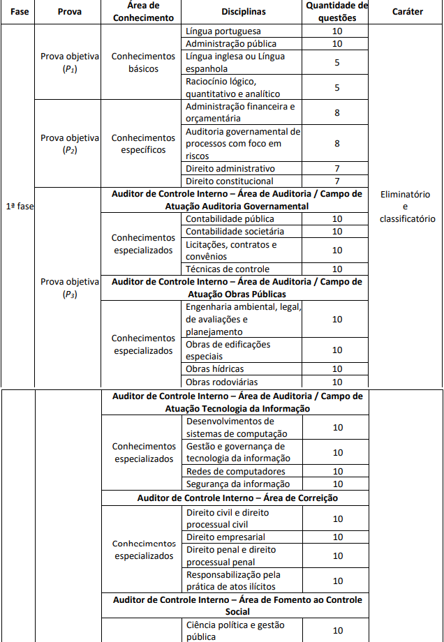 - Auditor de Controle Interno – Área de Auditoria – Campo de atuação Governamental: 9 vagas (7 AC + 2 para candidatos negros)