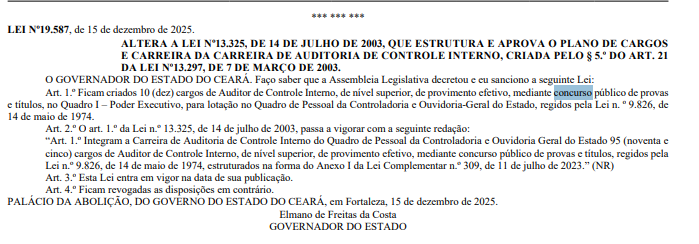 De acordo com a Lei nº 19.587/2025, sancionada pelo governador Elmano de Freitas e publicada em Diário Oficial do estado na última segunda-feira (15/12), os novos cargos são de nível superior, de provimento efetivo, e serão preenchidos por meio de concurso público de provas e títulos. Com a adição, o quadro da Carreira de Auditoria de Controle Interno passa a contar com 95 cargos no total.