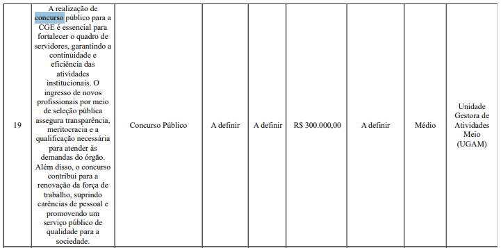 De acordo com o Plano Anual de Contratações de 2026, divulgado nesta quinta-feira (22), o órgão já conta com o desejo para realizar o edital para as carreiras da Controladoria. O grau de prioridade de compra é considerado médio.