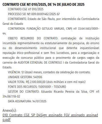 Foi publicado em Diário Oficial do estado nesta terça-feira (15/7), extrato de contrato que confirma a Fundação Getúlio Vargas (FGV) como organizadora do primeiro concurso público do órgão.