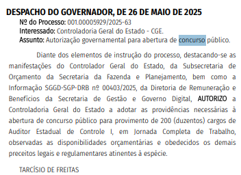 O despacho do governador foi publicado em Diário Oficial do estado nesta terça-feira (27/5), e contempla 200 cargos de Auditor Estadual de Controle.