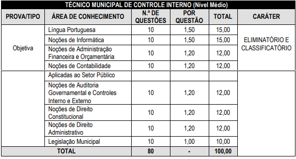 - 10 vagas para Técnico Municipal de Controle Interno (nível médio)
