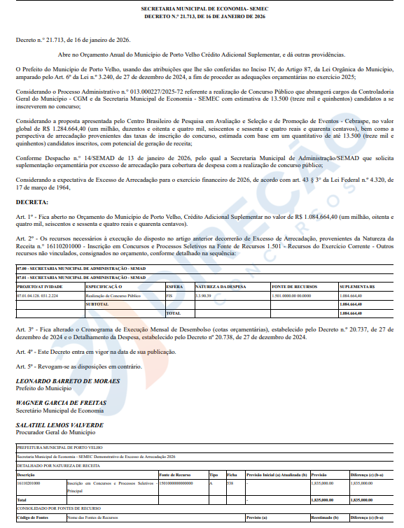 O vínculo com a banca Cebraspe foi oficializado pelo Decreto nº 21.713, de 16 de janeiro de 2026, assinado pelo prefeito Leonardo Barreto de Moraes. O documento estabelece crédito adicional suplementar no orçamento municipal para viabilizar a realização do certame, confira: