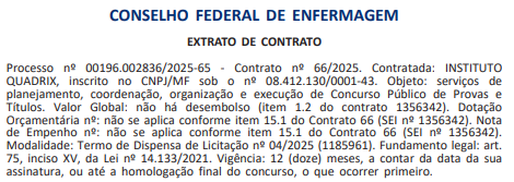 A contratação foi realizada por meio de Dispensa de Licitação e tem vigência de 12 meses ou até a homologação final do concurso, o que ocorrer primeiro. O documento afirma que o contrato não gera desembolso imediato de recursos.