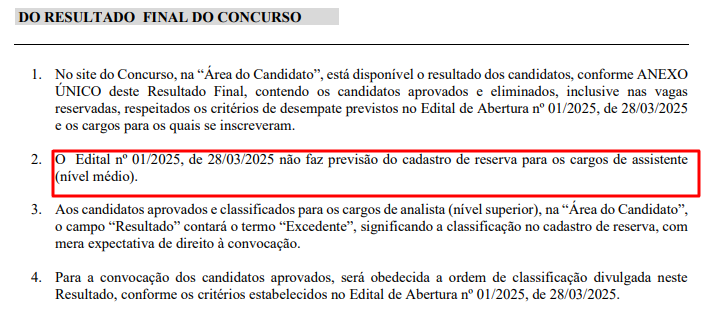 Entretanto, o cenário mudou drasticamente na virada do ano. O resultado final, cuja publicação atrasou e ocorreu de madrugada por volta de 1h da manhã do dia 31 de dezembro, trouxe uma afirmação surpreendente: o item 2 do documento declarou que o edital não previa cadastro de reserva para os cargos de nível médio.