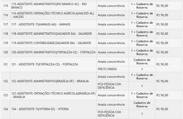Desde a sua publicação, o Edital nº 001/2025 do concurso Conab indicava que o concurso se destinava ao “provimento de vagas e formação de cadastro de reserva em cargos públicos efetivos”. Anexos da página da banca chegavam a listar explicitamente a configuração ” vagas imediatas + Cadastro de Reserva” para diversas localidades e cargos de assistente, como é possível ver na imagem abaixo: