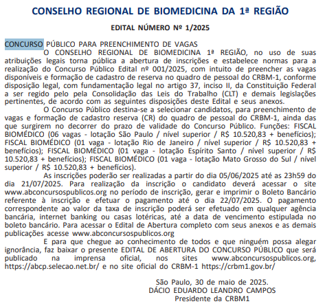 O último edital de concurso do CRBM 1 foi para o concurso público da Perícia Criminal do Estado de São Paulo, com vagas para biomédicos.