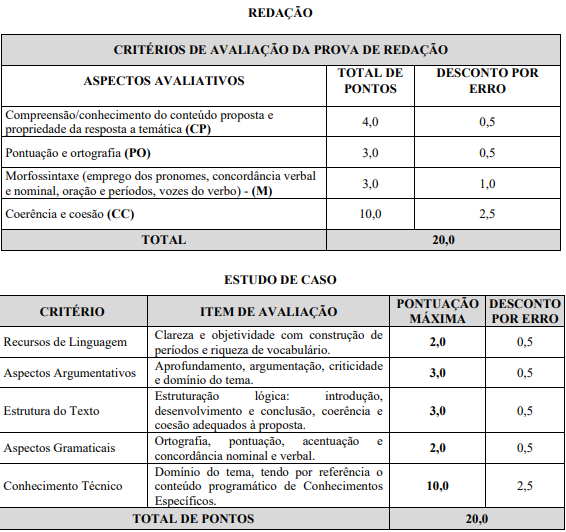 A Prova Discursiva será composta por redação, para cargo de nível médio e Estudo de Caso, para cargos de nível superior e valerá 20,0 (vinte) pontos, sendo eliminados os candidatos que tiverem nota zero ou que não obedecerem às orientações apresentadas no Caderno de Questões.