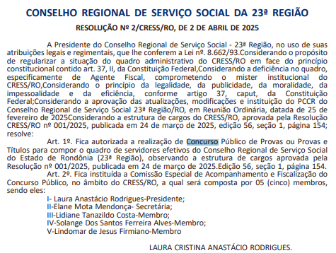 Foi publicado no Diário Oficial da União desta quinta-feira (3), a autorização oficial do concurso CRESS RO (Conselho Regional de Serviço Social da 23ª Região)!