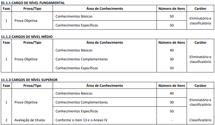 As provas para cargos de nível fundamental terão 100 questões de múltipla escolha e, para cargos de níveis médio e superior, a etapa será composta por 120 questões.