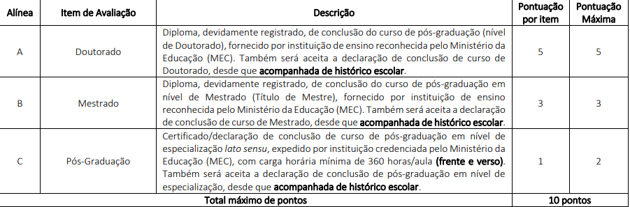 A avaliação de títulos valerá 10,00 pontos, ainda que a soma dos valores dos títulos enviados seja superior a esse valor.