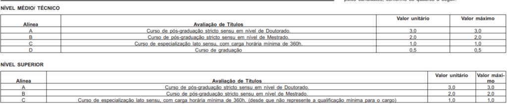 A prova de títulos consistirá na análise dos títulos apresentados pelos candidatos, conforme os quadros a seguir: