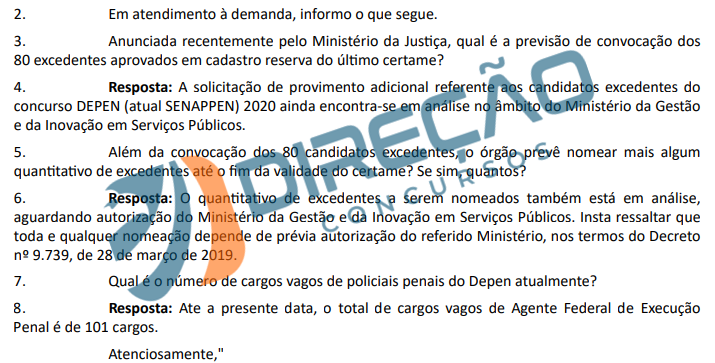 Ademais, o Depen informou que, atualmente, existem 101 cargos vagos de Agente Federal de Execução Penal. Dessa forma, é possível que mais aprovados sejam chamados para além das 80 solicitações. Fato que contribui para isso é que o último certame, realizado em 2020, teve seu prazo de validade prorrogado até maio de 2026.
