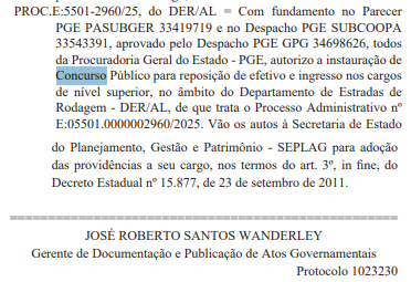 A autorização, que segue os trâmites legais com base em pareceres e despachos da Procuradoria Geral do Estado (PGE), foi assinada por José Roberto Santos Wanderley, Gerente de Documentação e Publicação de Atos Governamentais. Os autos foram encaminhados à Secretaria de Estado do Planejamento, Gestão e Patrimônio (SEPLAG) para a adoção das providências necessárias.