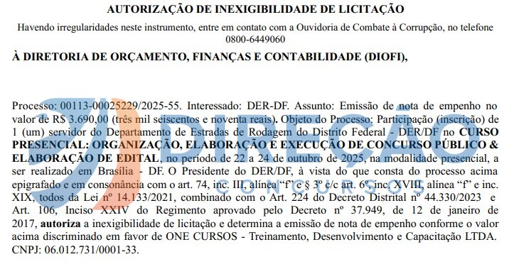 Em documento interno de 13 de outubro de 2025, ao qual o Direção Concursos teve acesso, o órgão autorizou a participação de um servidor em um curso presencial sobre organização, elaboração e execução de concursos públicos.
