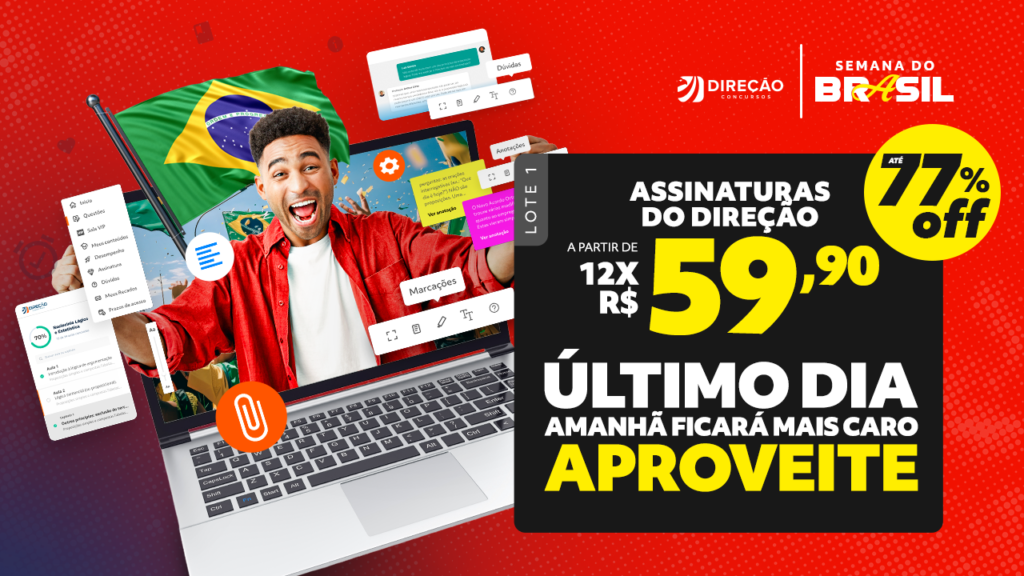 Aproveite até 77% de desconto nas assinaturas do Direção com a semana do Brasil, e inicie a sua jornada rumo à aprovação.