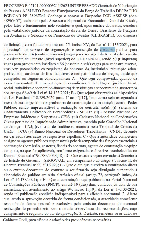 A Procuradoria Geral do Estado de Alagoas (PGE AL) aprovou a contratação direta do Centro Brasileiro de Pesquisa em Avaliação e Seleção e de Promoção de Eventos (Cebraspe) para organizar o tão aguardado concurso público do Departamento Estadual de Trânsito de Alagoas (Detran AL).