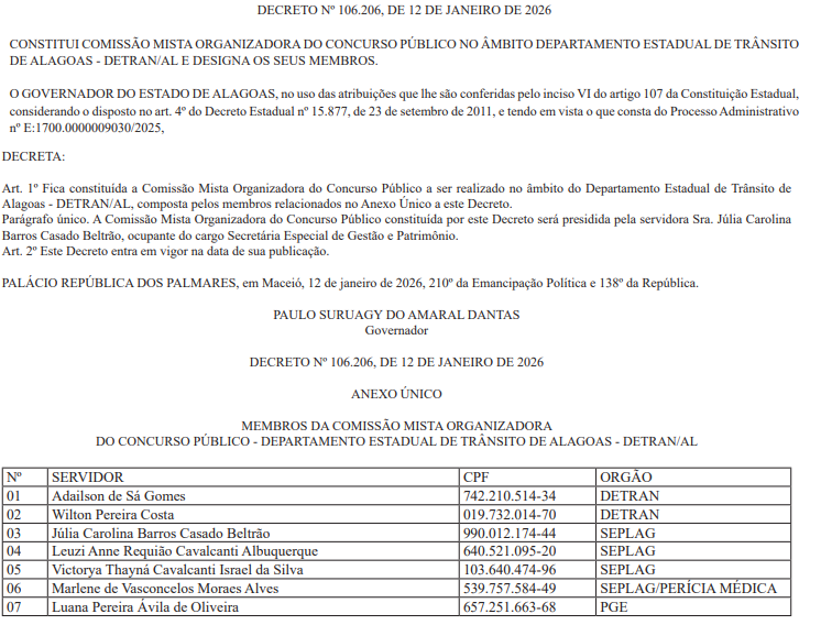 Foi publicada nesta terça-feira (13/1), em Diário Oficial do Estado de Alagoas, a constituição da Comissão Mista Organizadora do tão aguardado concurso público do Departamento Estadual de Trânsito de Alagoas (Detran AL).