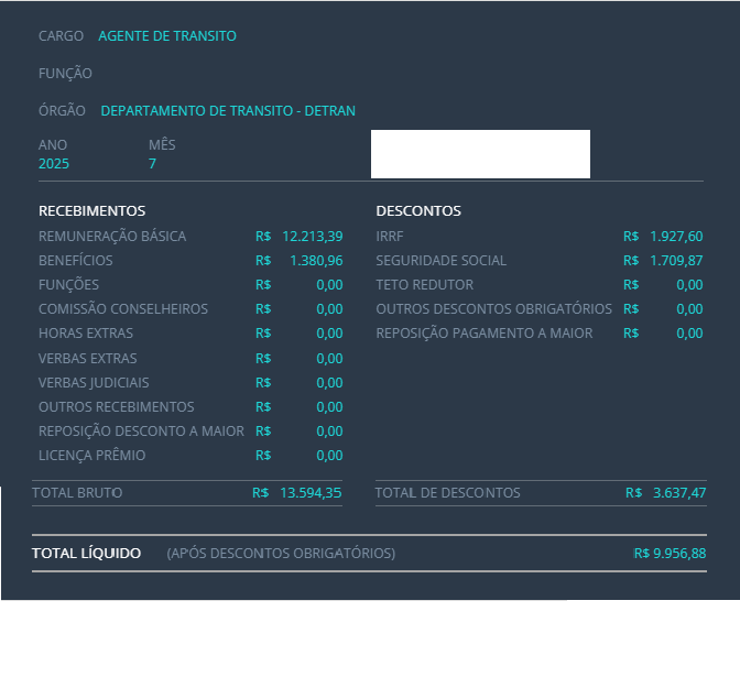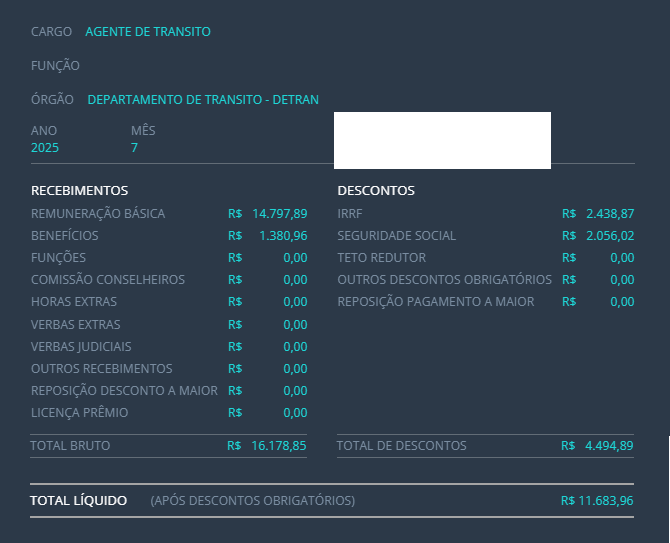 Os demonstrativos de pagamento revelam que a remuneração bruta total para Agente de Trânsito pode ultrapassar R$ 16 mil.