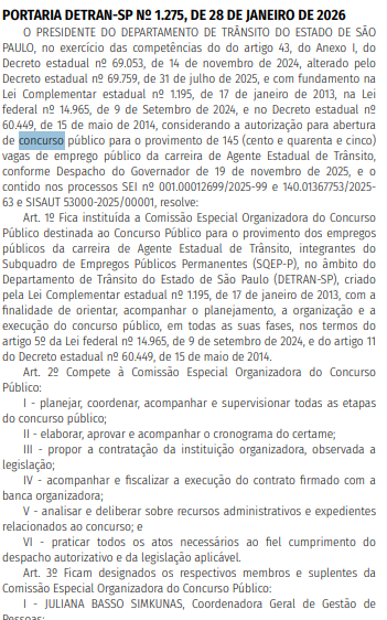 Nesta quinta-feira (29/1), foi publicada no Diário Oficial do estado a Portaria Detran-SP nº 1.275/2026, que institui a Comissão Especial Organizadora do certame.