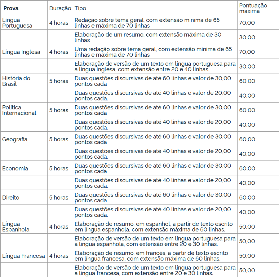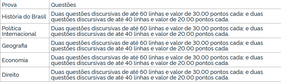 As quatro questões discursivas de cada uma das provas escritas de História do Brasil, Política Internacional, Geografia, Economia e Direito valerão um total de 100,00 pontos e serão aplicadas conforme quadro a seguir: