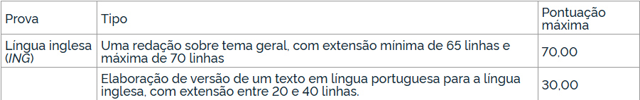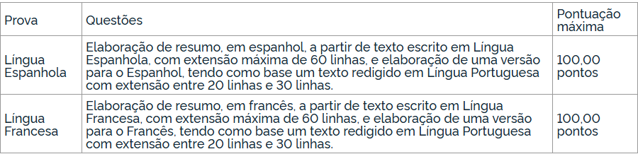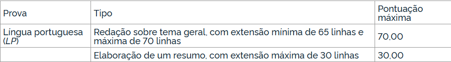 A redação e o resumo da prova escrita de Língua Portuguesa valerão um total de 100,00 pontos conforme o quadro a seguir: