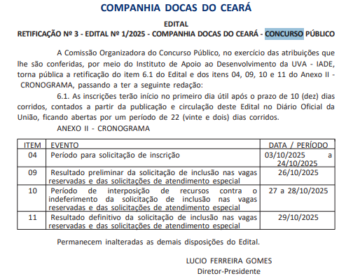 Já as provas objetivas seguem previstas para serem aplicadas na cidade de Fortaleza/CE, no dia 23 de novembro de 2025.
