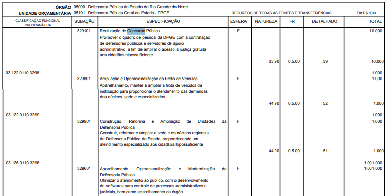 De acordo com o detalhamento aprovado, uma das ações orçamentárias para 2026 é justamente a “Realização de Concurso Público”, com o objetivo de “promover o quadro de pessoal da DPGE com a contratação de defensores públicos e servidores de apoio administrativo, a fim de ampliar o acesso à justiça gratuita aos cidadãos hipossuficientes”.
