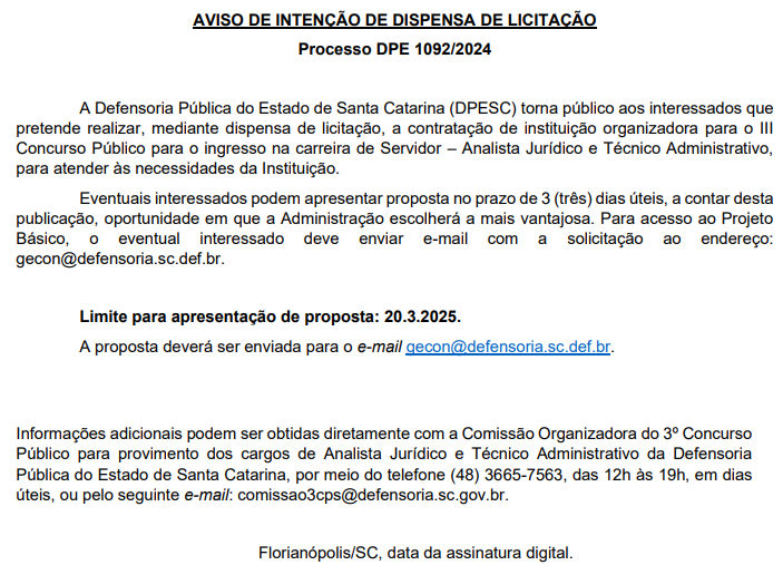 Isso porque foi publicado em Diário Oficial da DPE SC na última segunda-feira (17/3), aviso de dispensa de licitação que informa o início do processo de contratação da banca organizadora do certame.