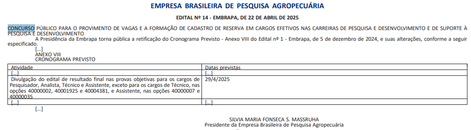 O cronograma do concurso Embrapa (Empresa Brasileira de Pesquisa Agropecuária) passou por uma nova retificação!